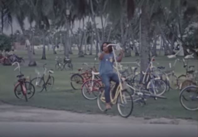 A cyclist on Kwajalein Island rides a modified “Kwaj bike” in a 1972 film