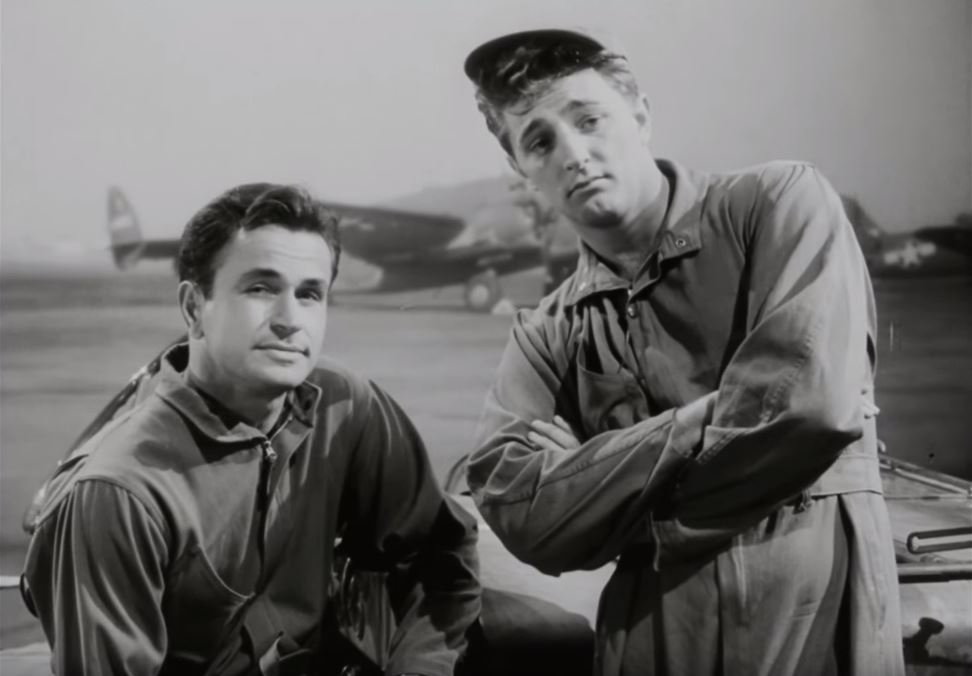 Noah Beery, Jr. and Robert Mitchum watch as other bomber crews depart on their missions. (Still from To the People of the United States)