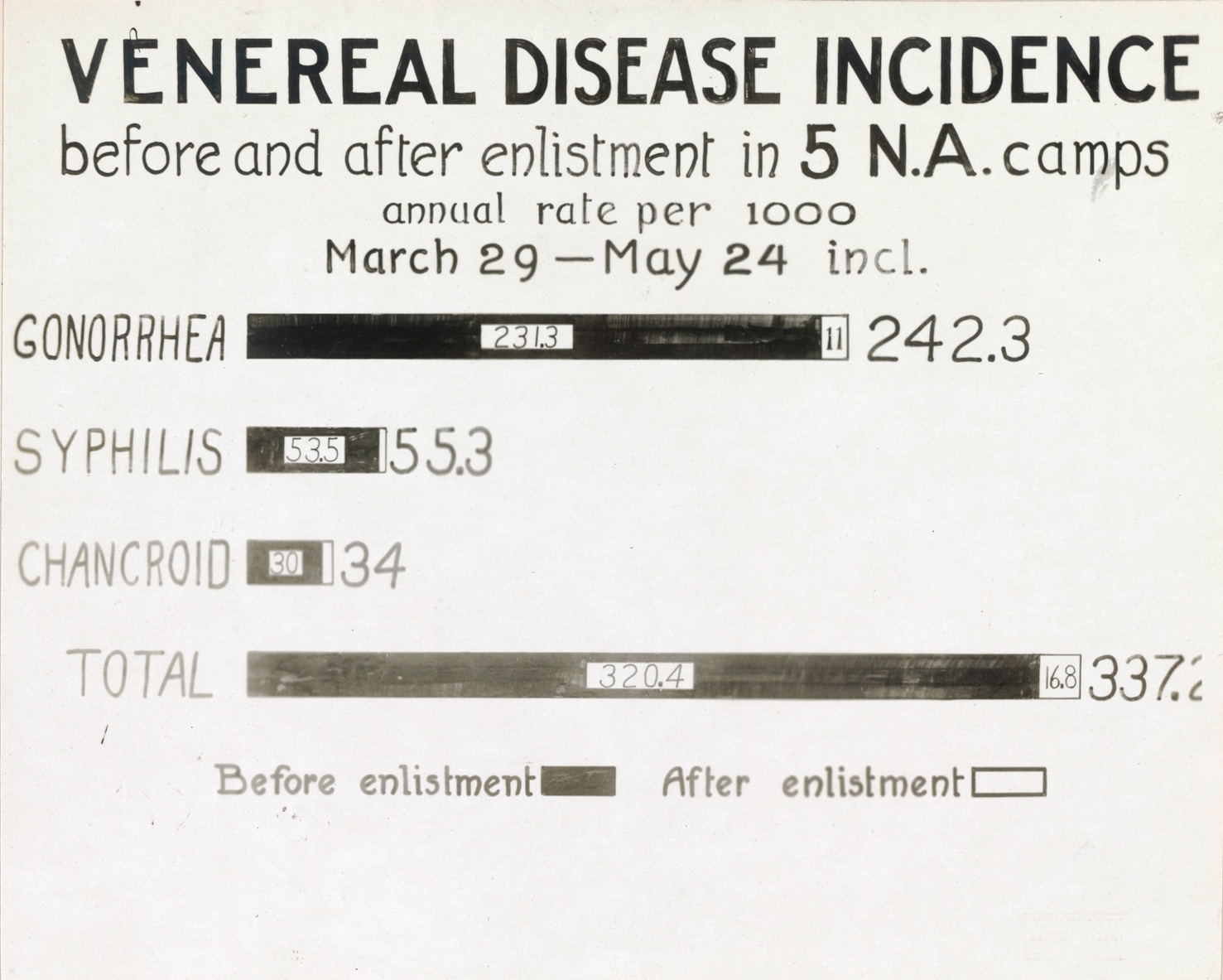 Venereal disease statistics collected during World War I showed that a significant percentage of the troops came in with untreated conditions. This chart shows the rate from March 29-May 24, 1918. (Local Identifier: 165-WW-267-B-015)