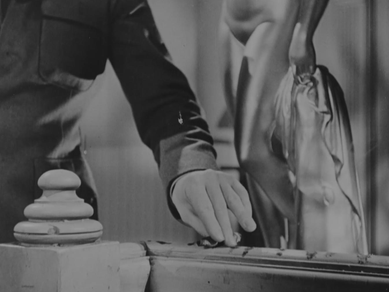 The second part is more subtle, yet extremely efficient and clever. A close-up shows a still-burning cigar resting on a banister at the top of a staircase. Multiple burn marks on the banister indicate that this cigar is not the first to be left here. A hand reaches down to pick up the cigar and the shot zooms out to show a disheveled Pete. He buckles his belt and goes on his way. In just fifteen wordless seconds, the viewer knows that Pete has likely visited a brothel and will suffer unsavory consequences.