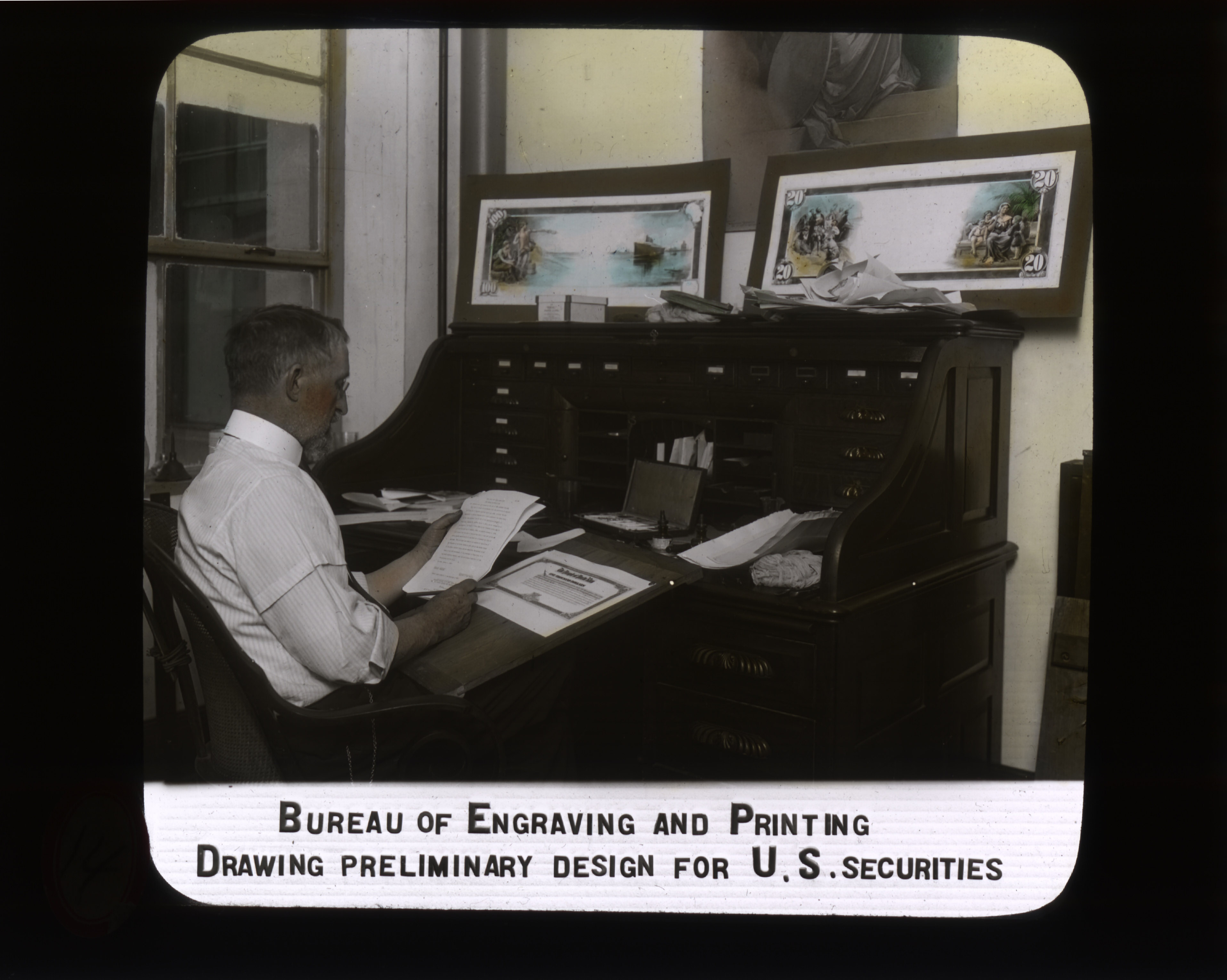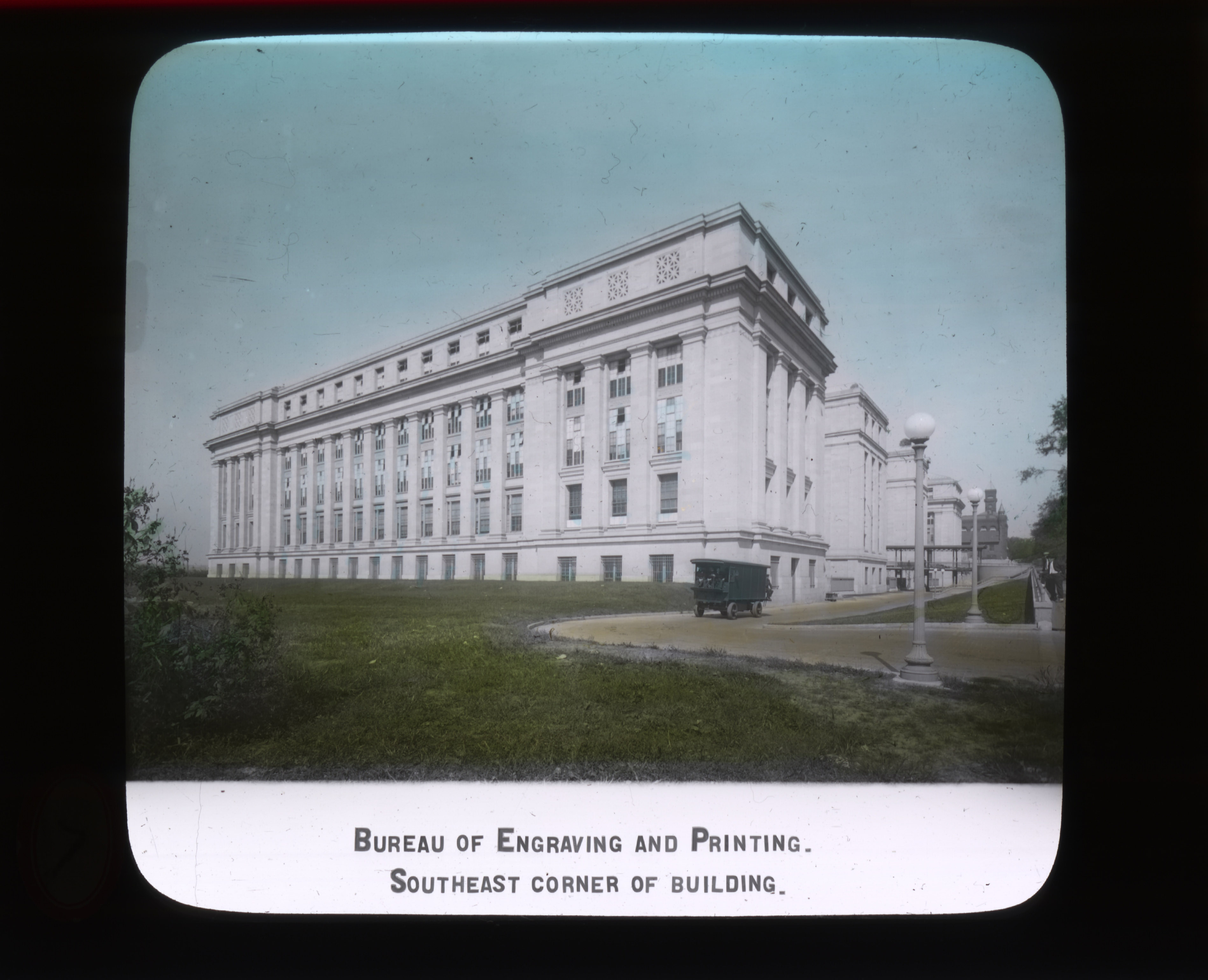 In 1914, the Bureau of Engraving and Printing’s (BEP) operations moved to a new building, built in the neoclassical style, on 14th St. in Washington, DC. The Still Picture Branch of the National Archives preserves a set of hand-tinted lantern slides produced for either the 1915 Panama Pacific Exposition or the Mississippi Centennial in 1917 to illustrate the activities of the bureau. The series contains approximately 145 lantern slides depicting the various activities of currency production. Scenes include interiors and exteriors of the then new Engraving and Printing building in Washington, DC, transportation of money, storage vaults, employee break areas, and other aspects of currency production.