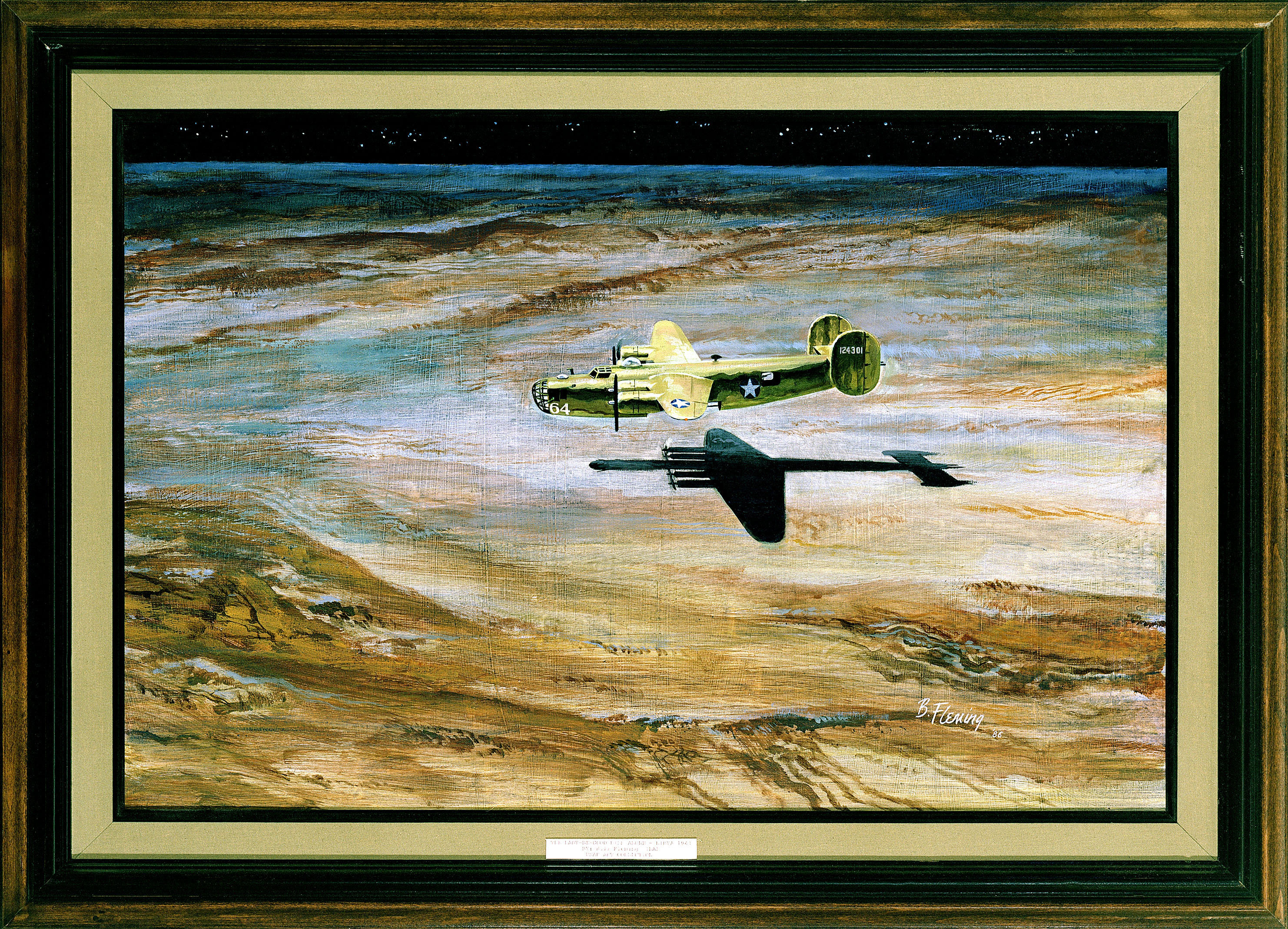 A couple of correction: Staff Sergeant Samuel Adams’ middle initial is E (for Ellis) not R. There were only two waves that went on Mission 109, they were “A” Flight and “B” Flight. The “Lady” DID catch up to her position in “B” Flight and became the leader just before getting to the target. The D’Arcy team found the “Lady” on Feb. 27. “Operation Climax” was in operation when Shelley’s body was found by the oil team. The Air Force found Ripslinger’s body a few days later. Shelley was found 37 miles NW of the group of five while Ripslinger was found 11miles BACK or only 26 miles from the group of five. Also, in Willard Fleming’s painting The “Lady” crashed at night and she was Desert Pink NOT olive Drab.