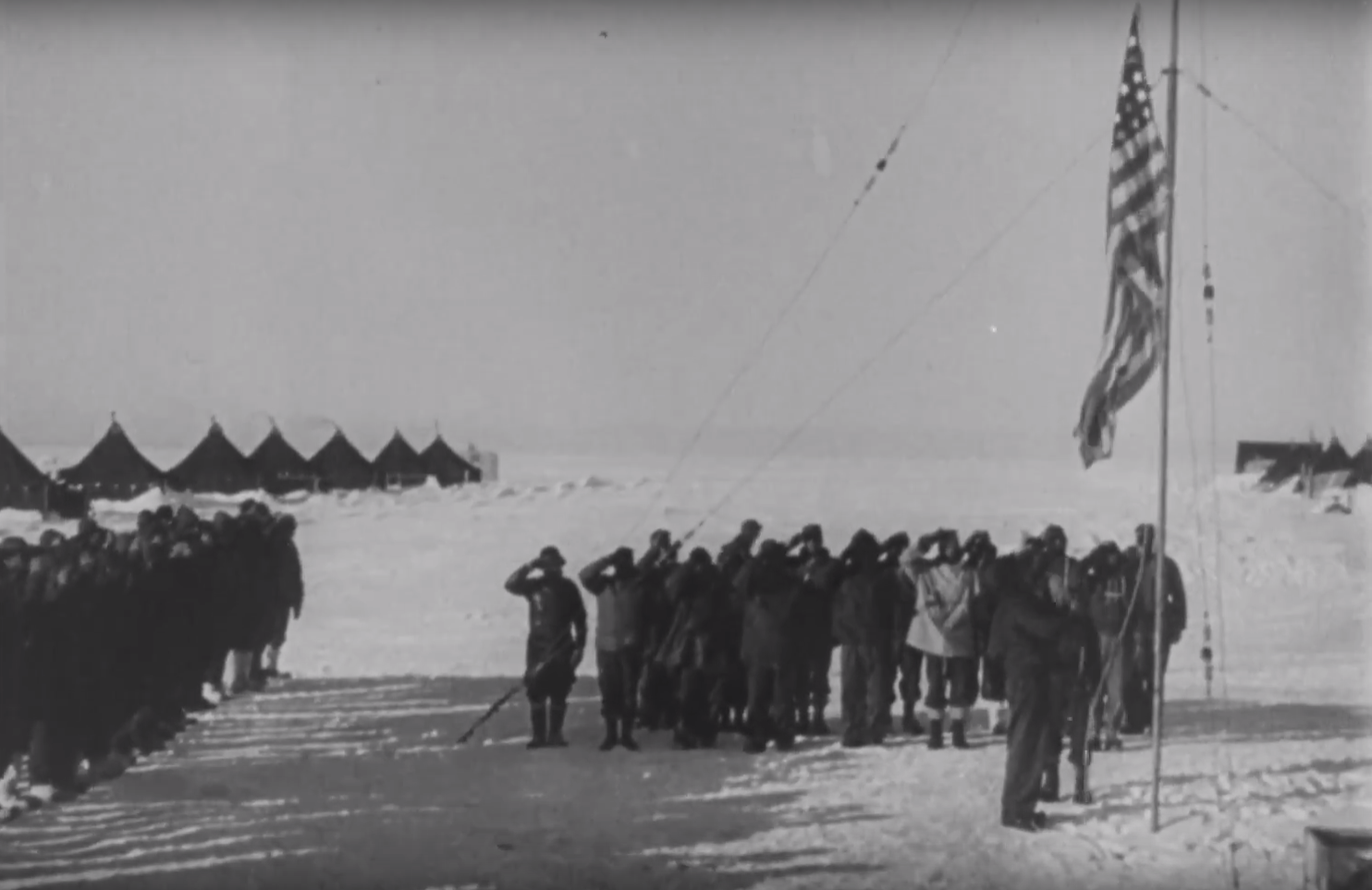 At the base Little American IV, sailors salute the American flag as it is raised.