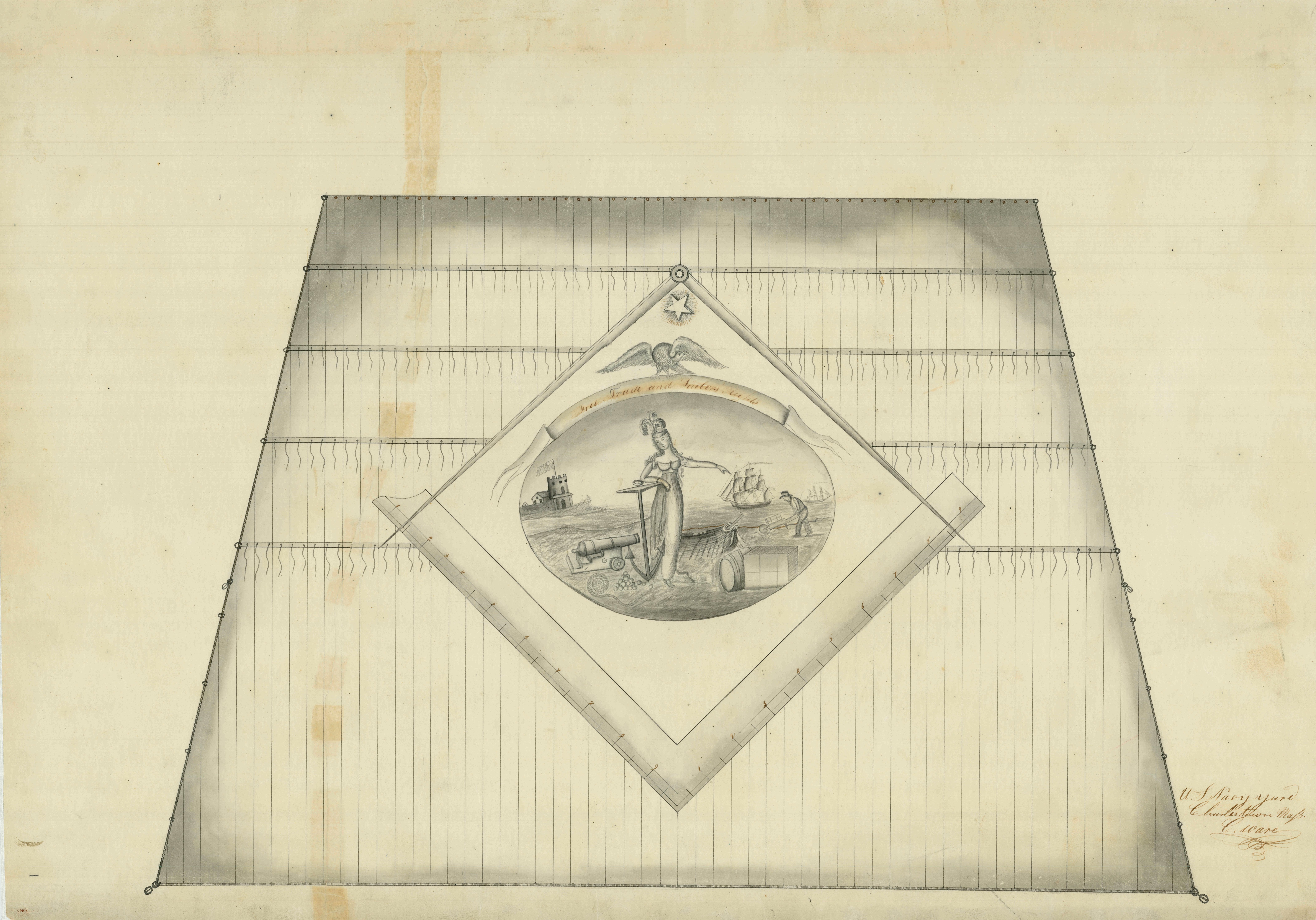 This drawings features a sail design for a naval vessel. The design was a strong and recurrent theme during the War of 1812. “Free trade” referred to the protection of American commerce while “Sailors’ Rights” referred to a desire for the end the British impressment of American sailors. Drawings from this series were also digitized this year and are available at the following link: Drawings of Naval Vessels and Equipment. Additional information about the Charles Ware Drawings can be found on our previous blog post, “Lynxes and Alligators and Ships, Oh, My! The Ships of the Ware Collection.”