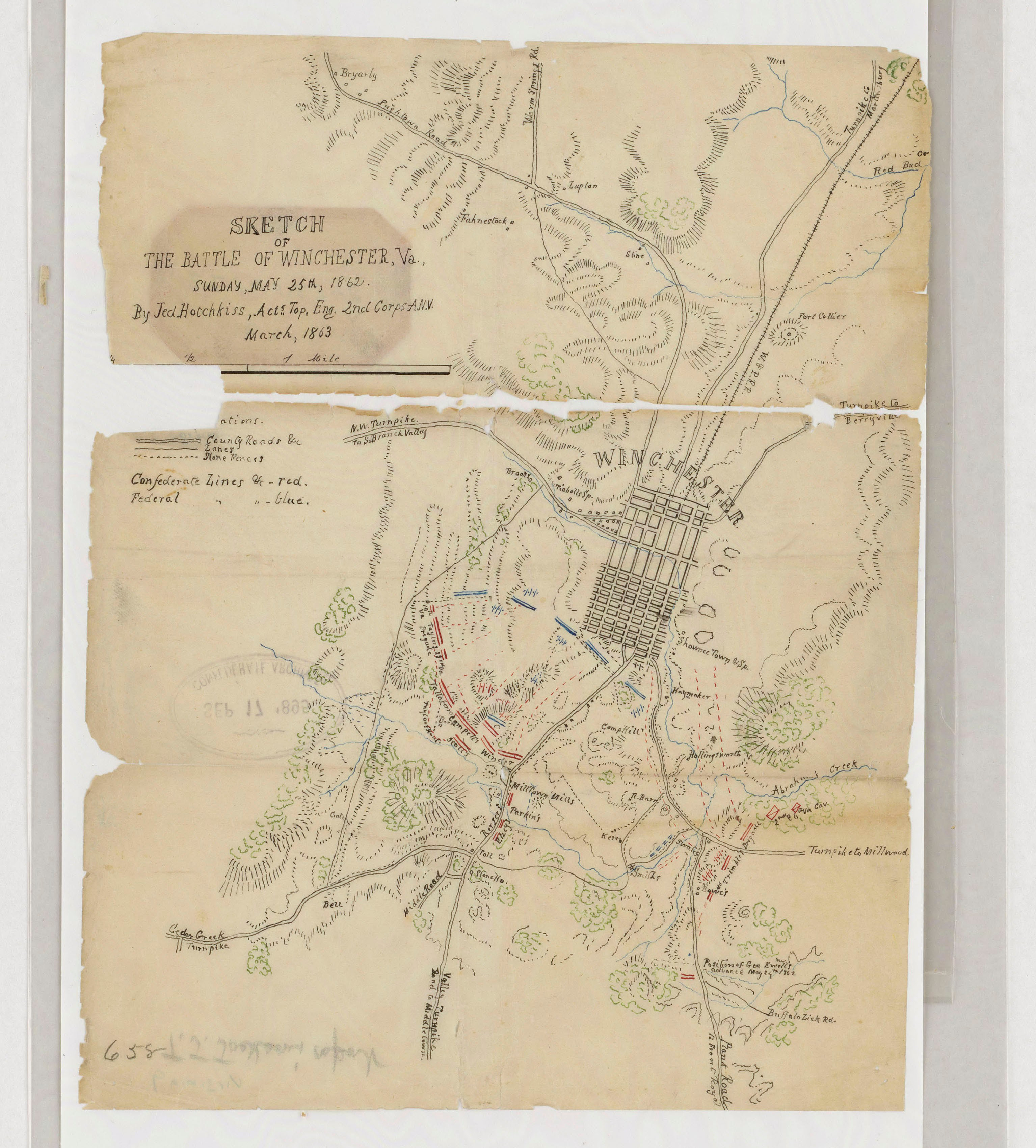 When the Civil War broke out in the spring of 1861, Hotchkiss’ students left his school to enlist. Hotchkiss, although not in favor of southern secession, eventually volunteered his services to the Confederacy. In the spring of 1862, Hotchkiss’ mapping skills were noticed by army commanders, and he was assigned as a topographic officer to General Thomas “Stonewall” Jackson’s corps. Jackson famously asked him “to make me a map of the Valley, from Harpers Ferry to Lexington, showing all the points of offense and defense in those places.” Over the next several months, Hotchkiss completed the map of the Shenandoah Valley, which ended up being over eight feet long. His knowledge of the Shenandoah Valley also made him a valuable resource during Jackson’s Valley Campaign, during which he provided information and reconnaissance about the terrain and roads.