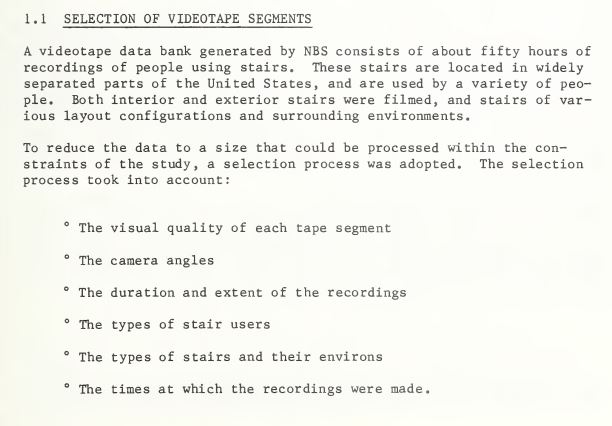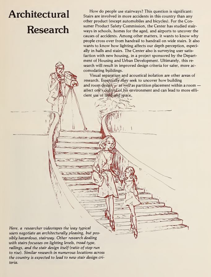 Drilling down even further, I was able to locate a document on govinfo about the department within the NBS where this research was done. The Center for Building Technology: A Perspective contains a description of the stair safety research project and an illustration of a researcher videotaping a set of stairs.