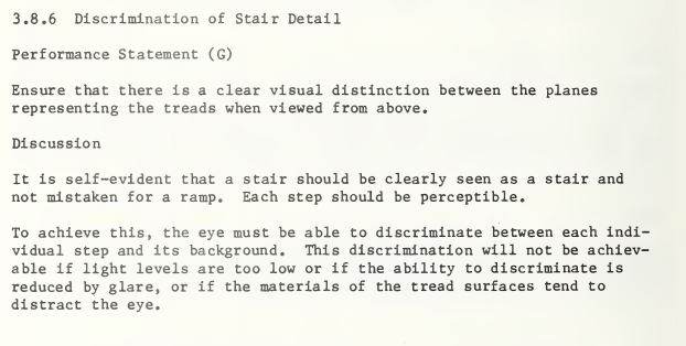 An Analysis of the Behavior of Stair Users tells us that the researchers used coded data derived from the video segments to develop recommendations to improve stair design and reduce accidents. For example, distracting patterns can make it difficult to see where each step ends: