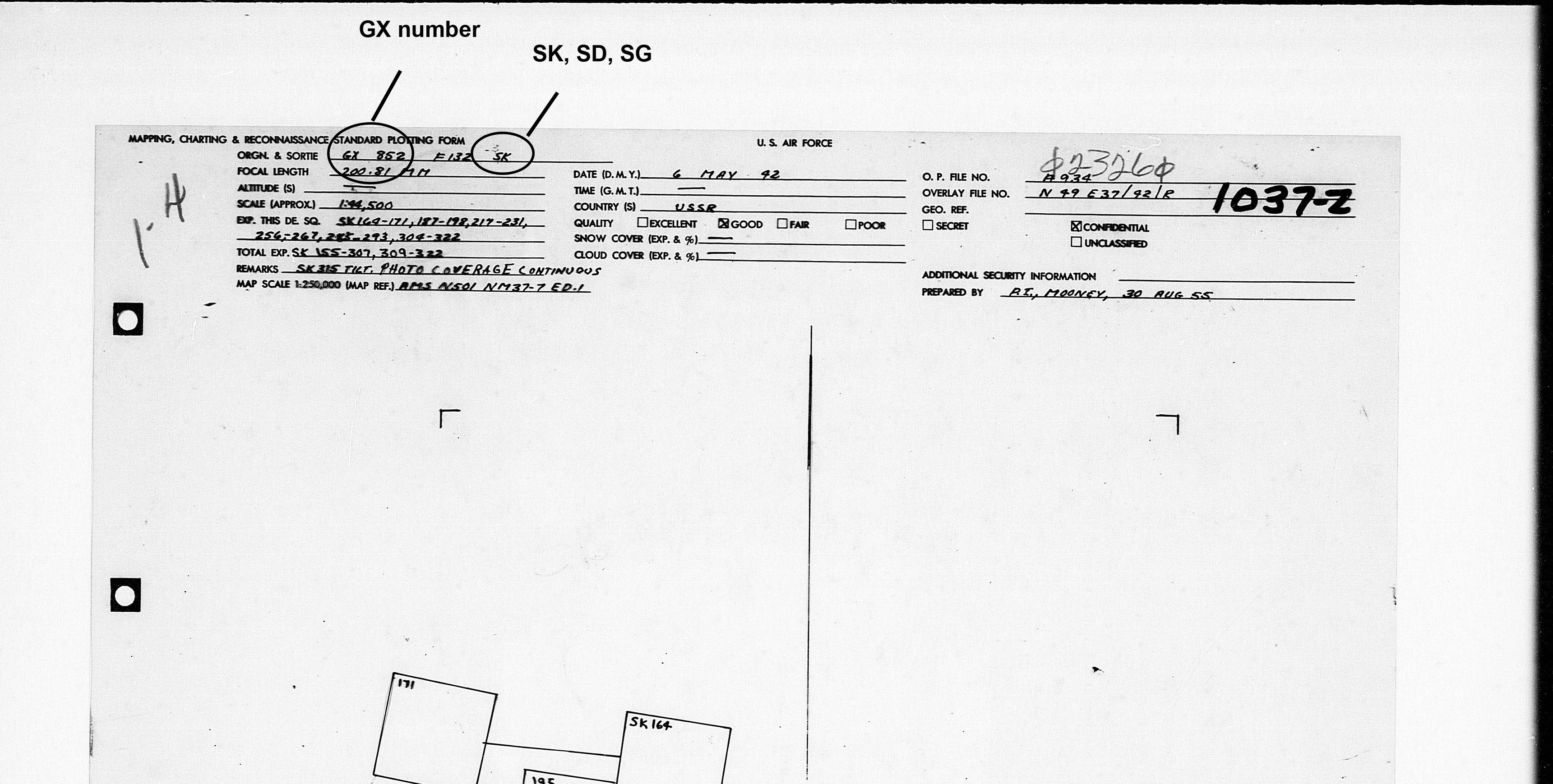 Our Captured German aerials are located by the GX, TUGX, or other related number, which is typically located near the top of the overlay index sheet. In order to request GX prints, the GX print number and whether the print is an SK, SD, or SG print is needed. The GX number is typically found on the Orgn. & Sortie line. The SK, SD, or SG designation can be found on that same line, or may sometimes be found further down on the first column of information.