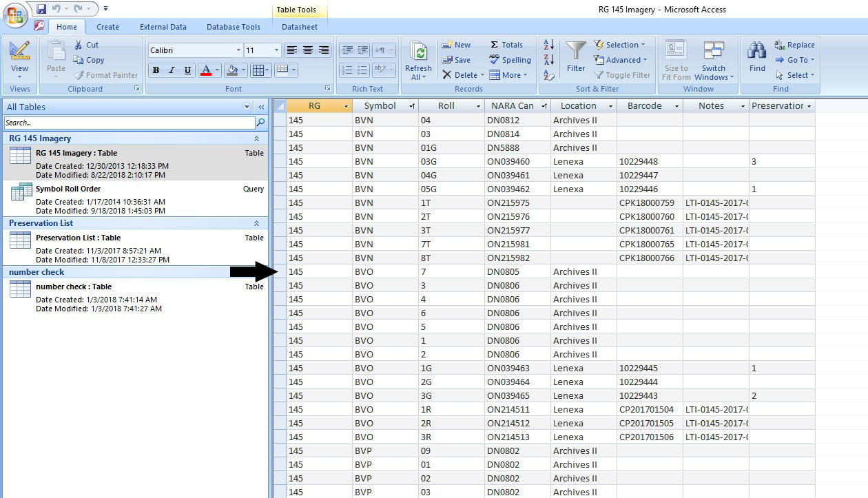 After locating the roll and spot number, the next step is to check our Can Locators, which are available both electronically and as a hard copy in our research room or may be downloaded as a spreadsheet at the following link: RG 145 Can Locator. Look up the symbol and roll number to determine which can of rolled aerial negatives contains the specific imagery. If the can is a “DN” can, that means that it is a duplicate and is available to request in our College Park research room as a normal pull. If the number is an “ON” number, that means it is an original negative and is stored off-site in cold storage for preservation reasons. ON cans need to be ordered and then can be viewed in our College Park research room. There is approximately a 3 business day delay before the film is available for use.