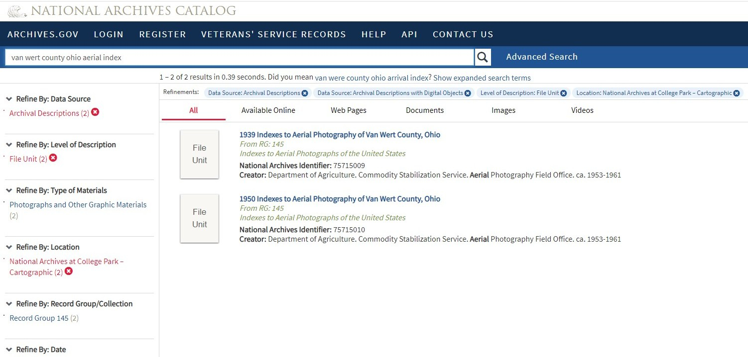 To locate the aerial indexes in our catalog for a particular county, we recommend using the advanced search option, and entering the county and state name, along with the term “aerial index” (example: Van Wert County Ohio Aerial Index) in the search term field, and then selecting File Unit for the Level of Descriptions field and National Archives at College Park – Cartographic Branch for the location of materials field. This search should yield results similar to the screenshot below: