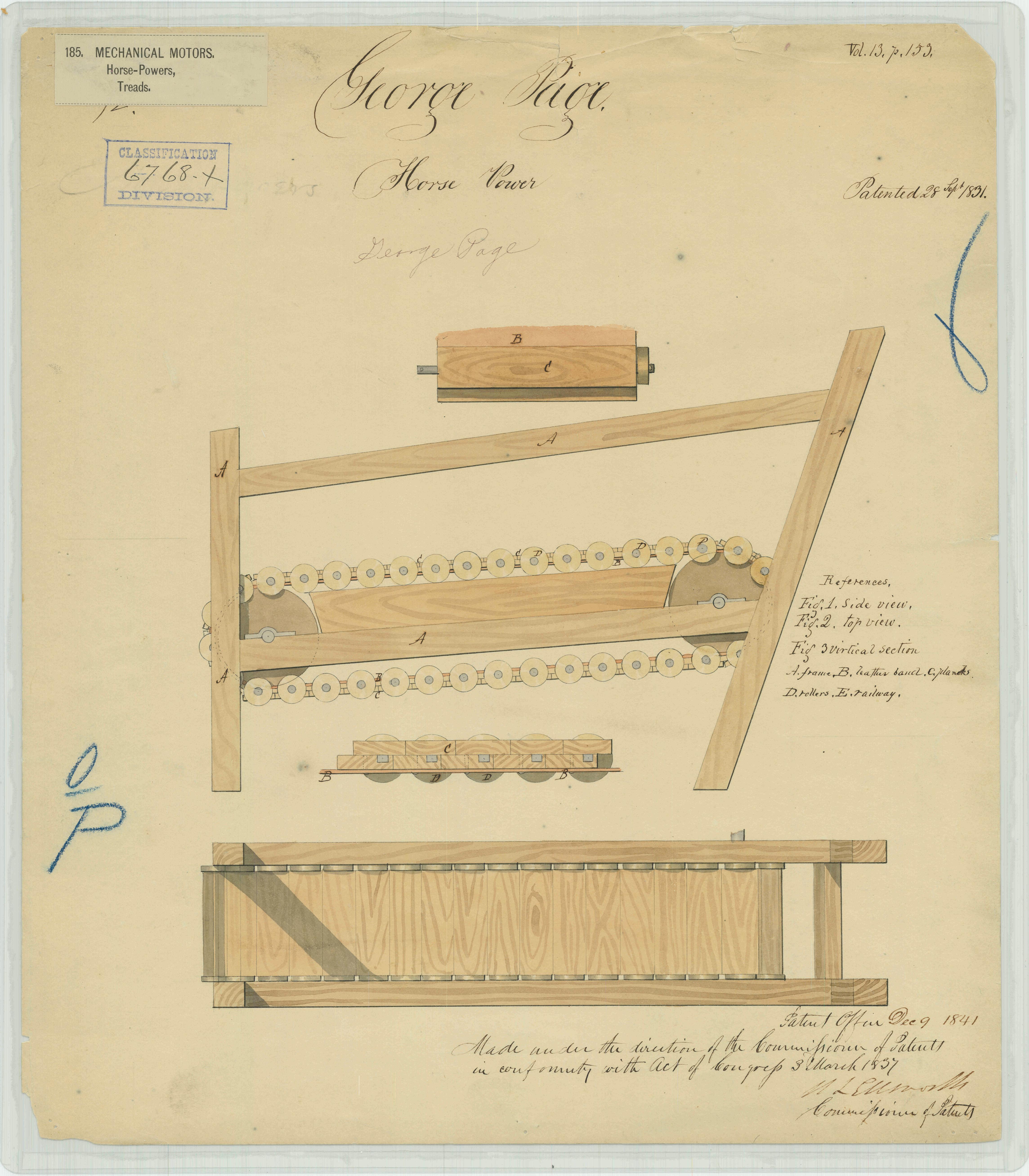 RG 241: Restored Patent Drawings.  George Ezra’s Patent Drawing for Horse Power, September 28th, 1831.  6768-X.  (NAID 159160200)