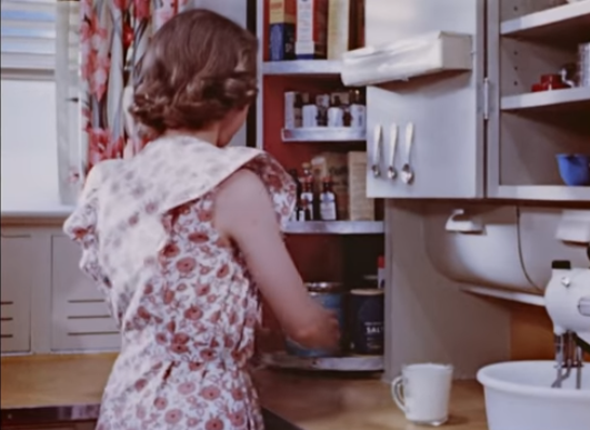 A Step Saving Kitchen was filmed in 1949 by the Bureau of Human Nutrition and Home Economics. It was created in response to many housewives writing to the Bureau looking for tips on how to cut down the time spent doing kitchen work and how to make things more convenient for them in the kitchen.