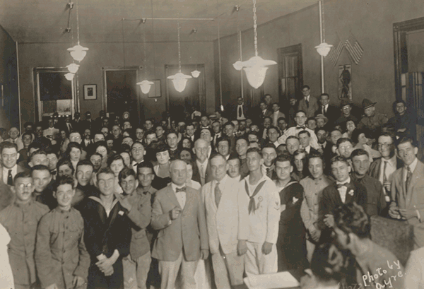 Examining items closely can yield further exciting results. The archaeological term in situ, from Latin, refers to finding an artifact in its original location. In “Archives Memory,” discovering an image in situ provides context and insight that is greater than the sum of its parts. Consider this example of a poster hidden in plain sight within a photograph from 1918: