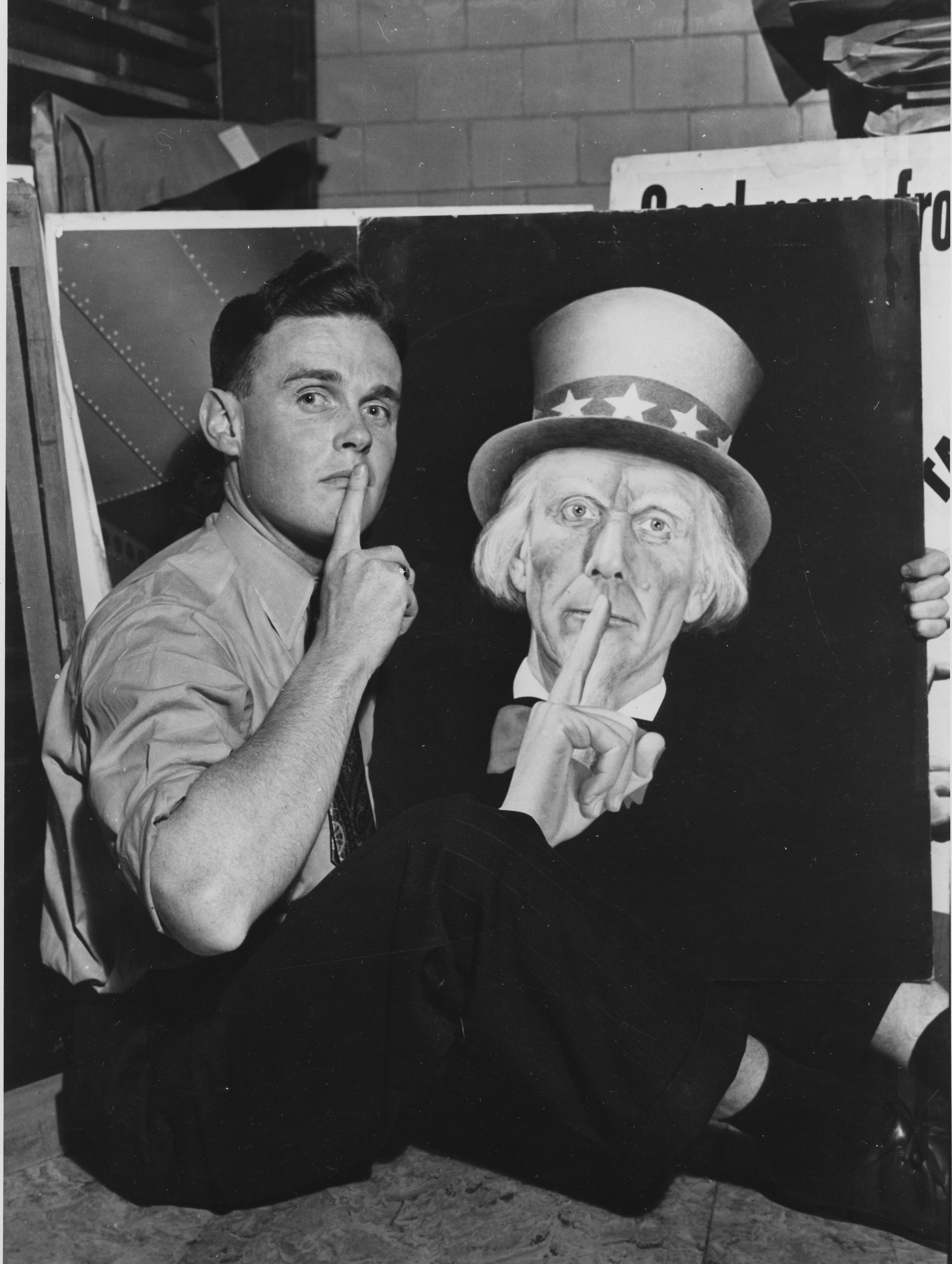 However, Sloan’s Uncle Sam makes a second known appearance in the National Archives Catalog and lives to see another day in the photograph below alongside a playful employee.