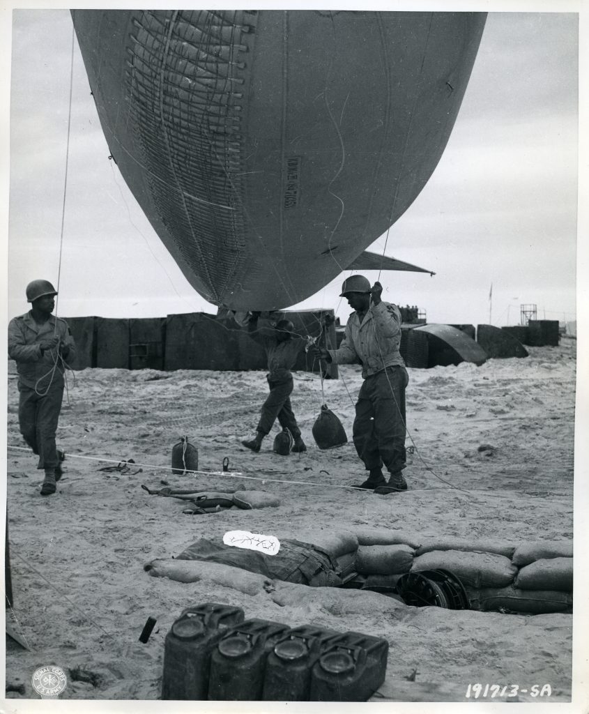 “Local Photo ID: 111-SC-191713-S (NAID 176888074). Original Caption: “Corps. A. Johnson, Houston, Texas, assisted by some of his men, walk a balloon over to the winch, somewhere in France.” Date: July 24, 1944. Original Field Number: ETO-HQ-44-8460. Photographer: Gedicks”