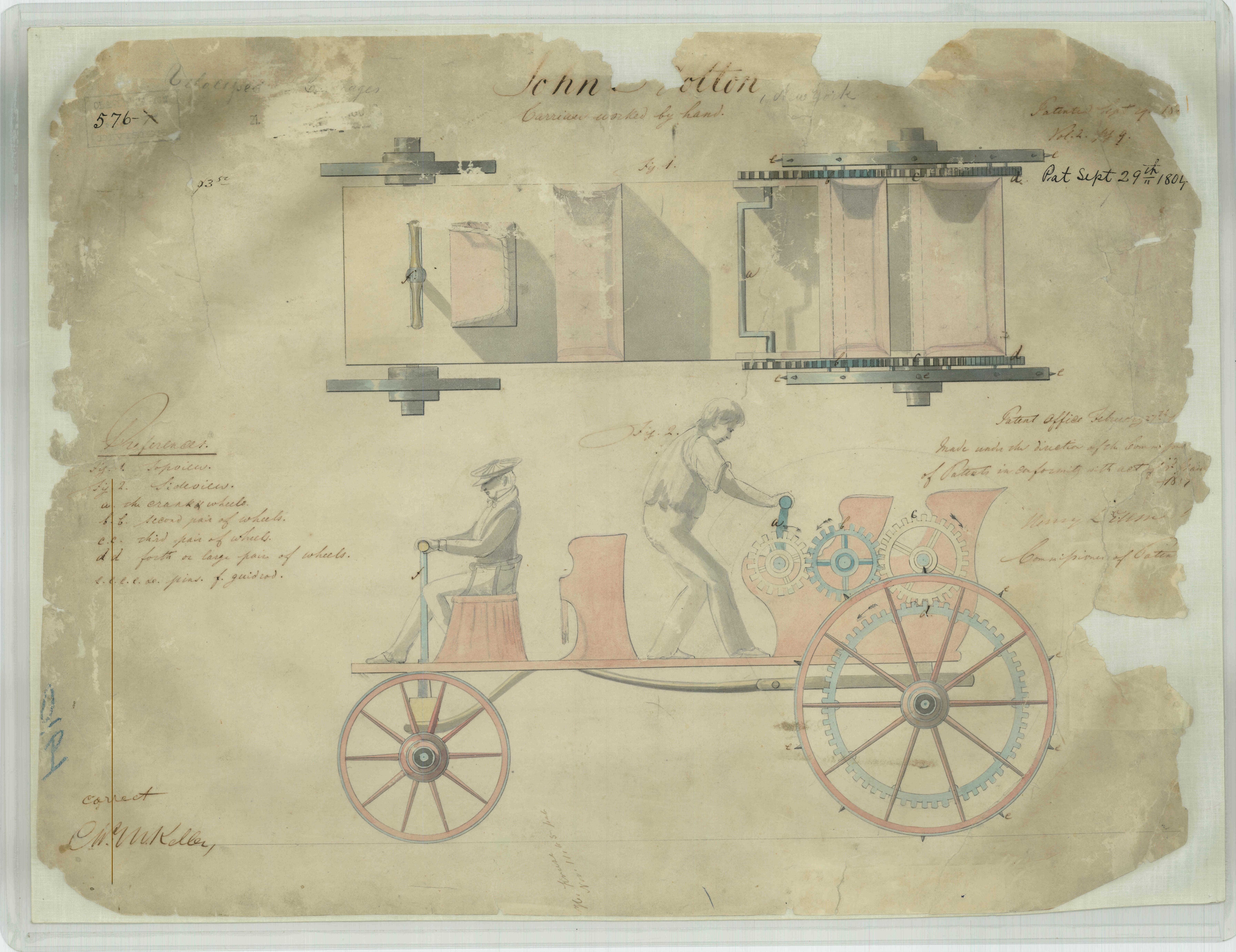 RG 241: Restored Patents, 576X.  John Cotton’s Patent Drawing for a Carrier Worked by Hand.             NAID: 149285619.
