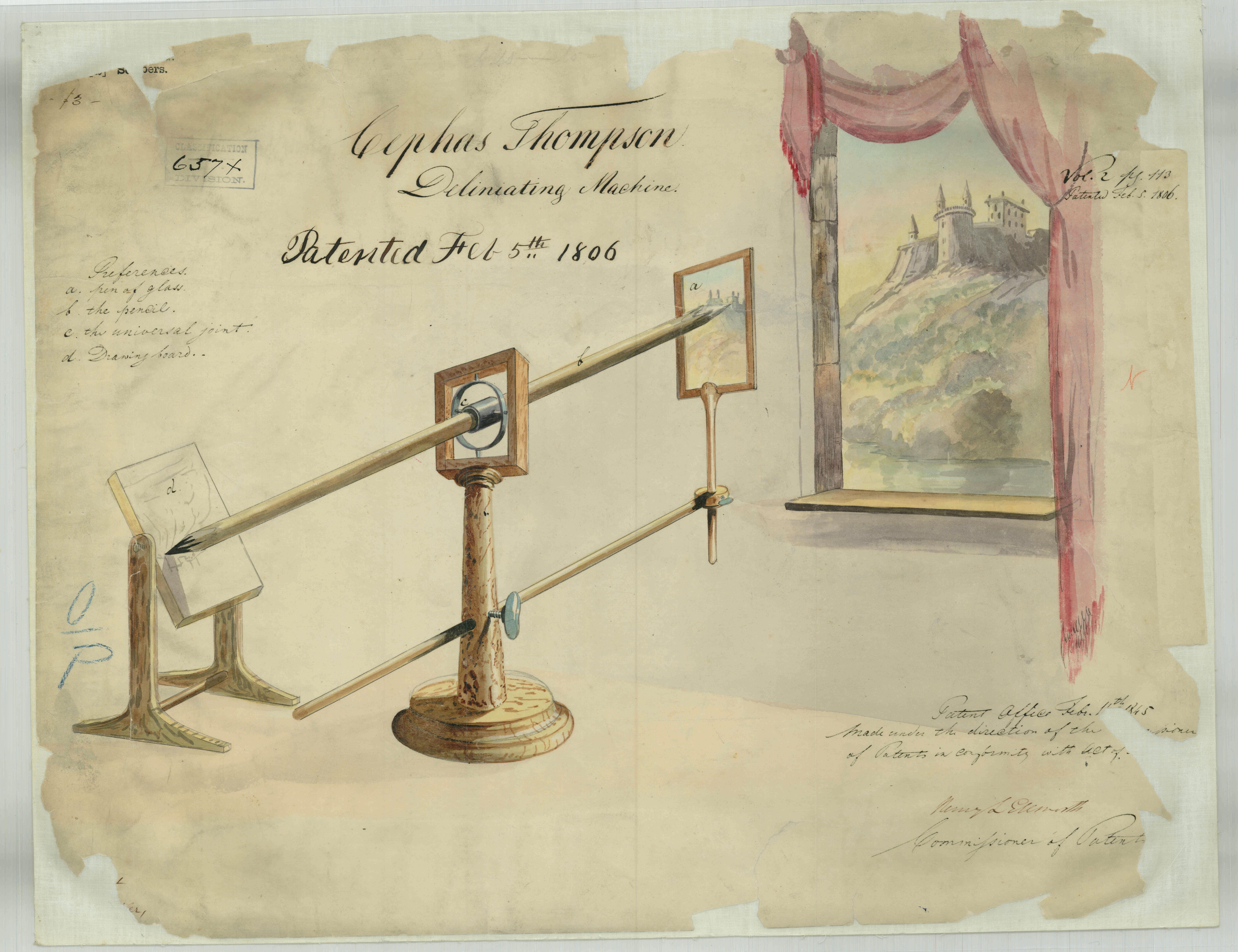 RG 241: Restored Patents, 657X.  Cephas Thompson’s Patent Drawing for a Delineating Machine.   NAID: 149285629.