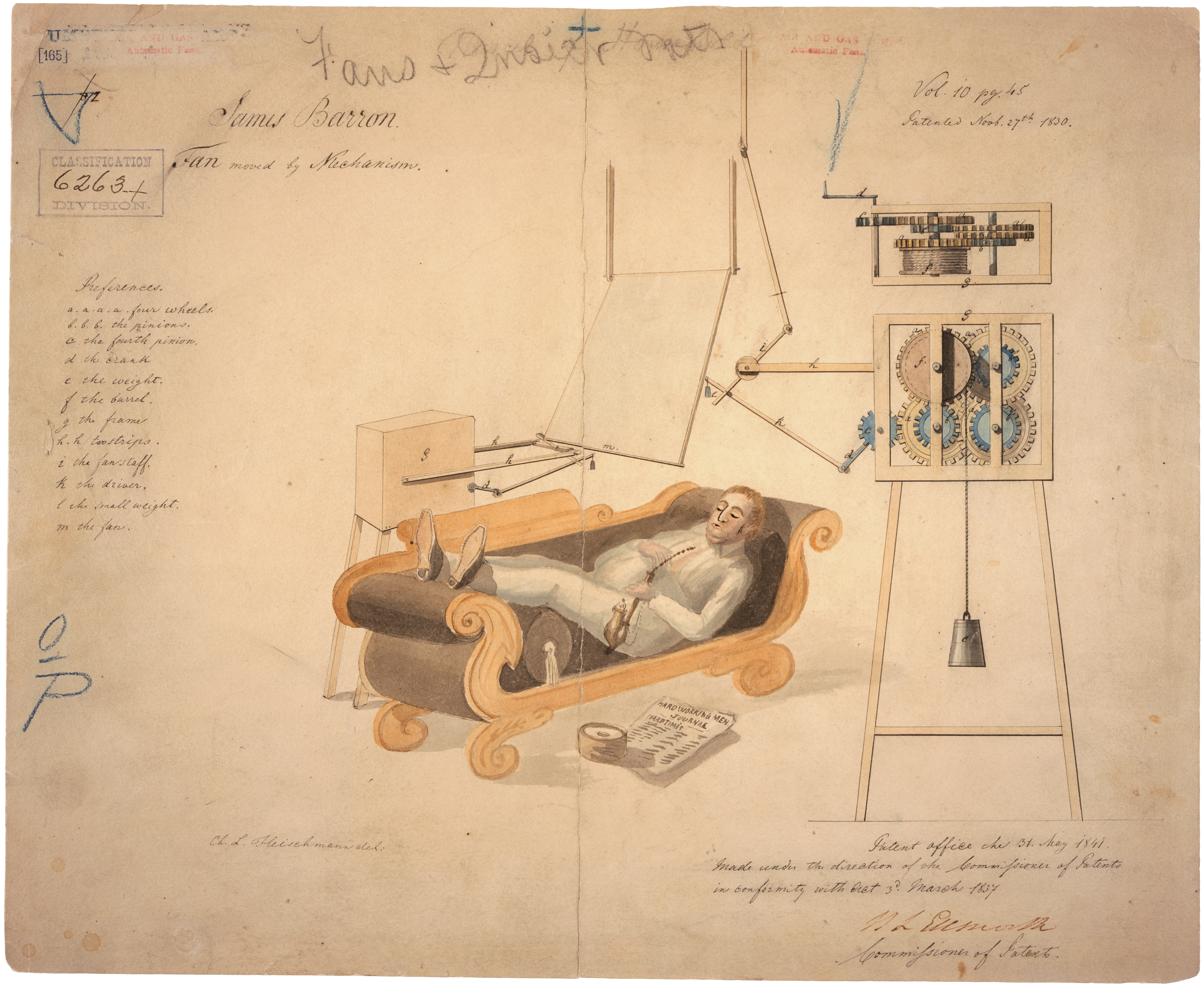 RG 241: Restored Patents, 6263X.  James Barron’s Patent Drawing for a Fan Moved by Mechanism.  NAID: 159159909