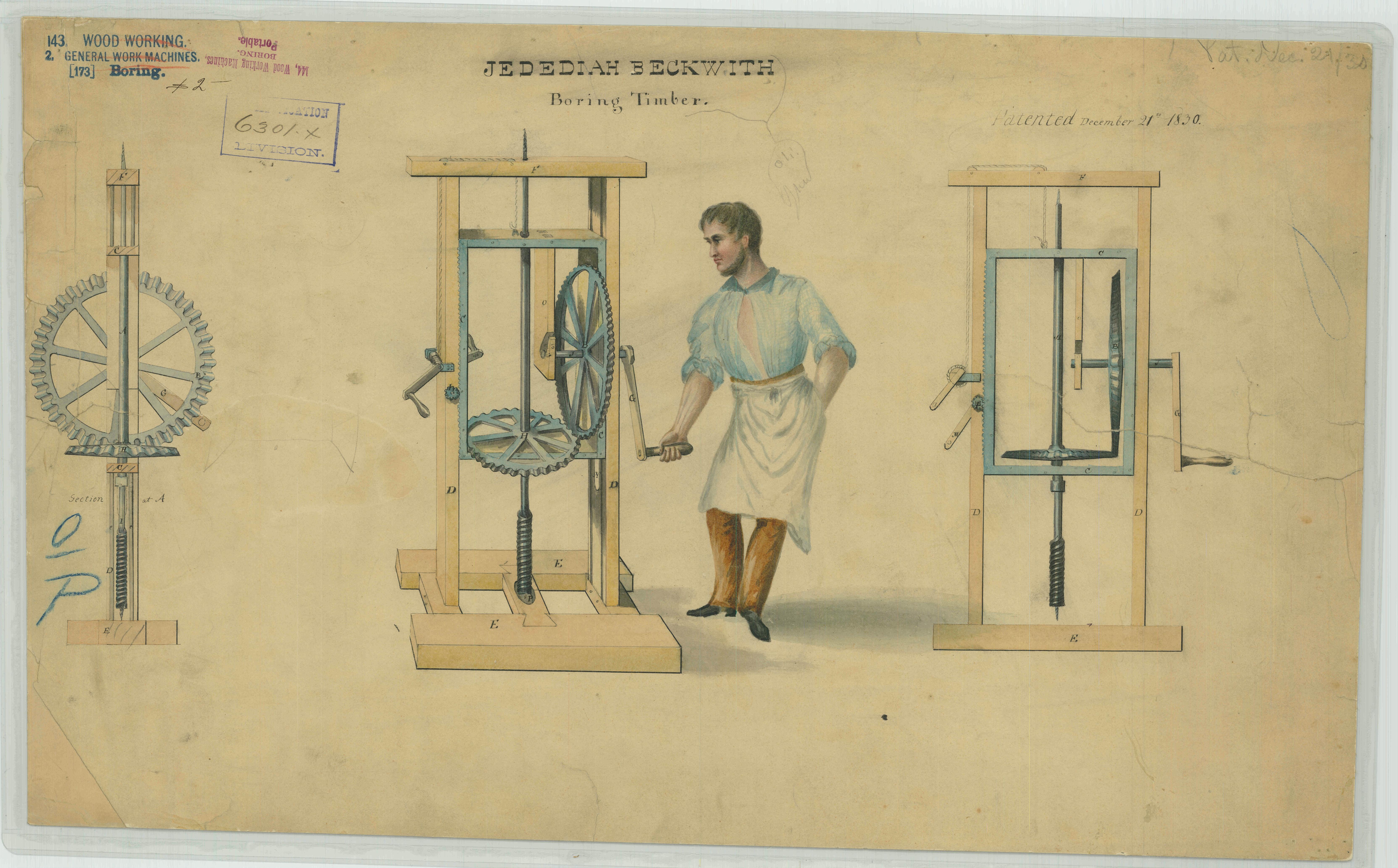 RG 241: Restored Paatents, 6301X.  Jedediah Beckwith’s Patent Drawing for a Machine for Boring Timber.  NAID: 159159922.