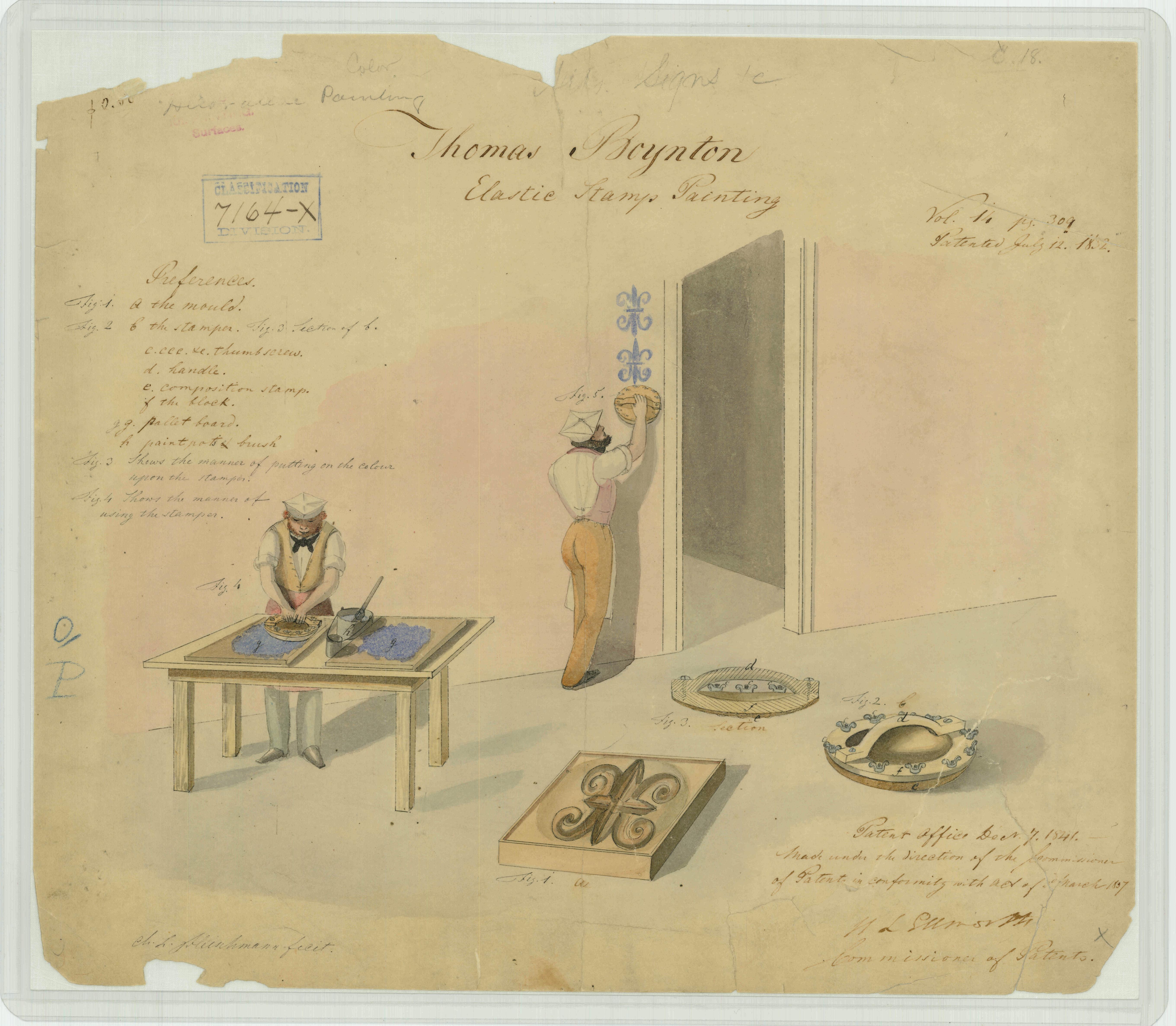 RG 241: Restored Patents, 7164X.  Thomas Boynton’s Patent Drawing for Elastic Stamp Painting.  NAID: 169378684.