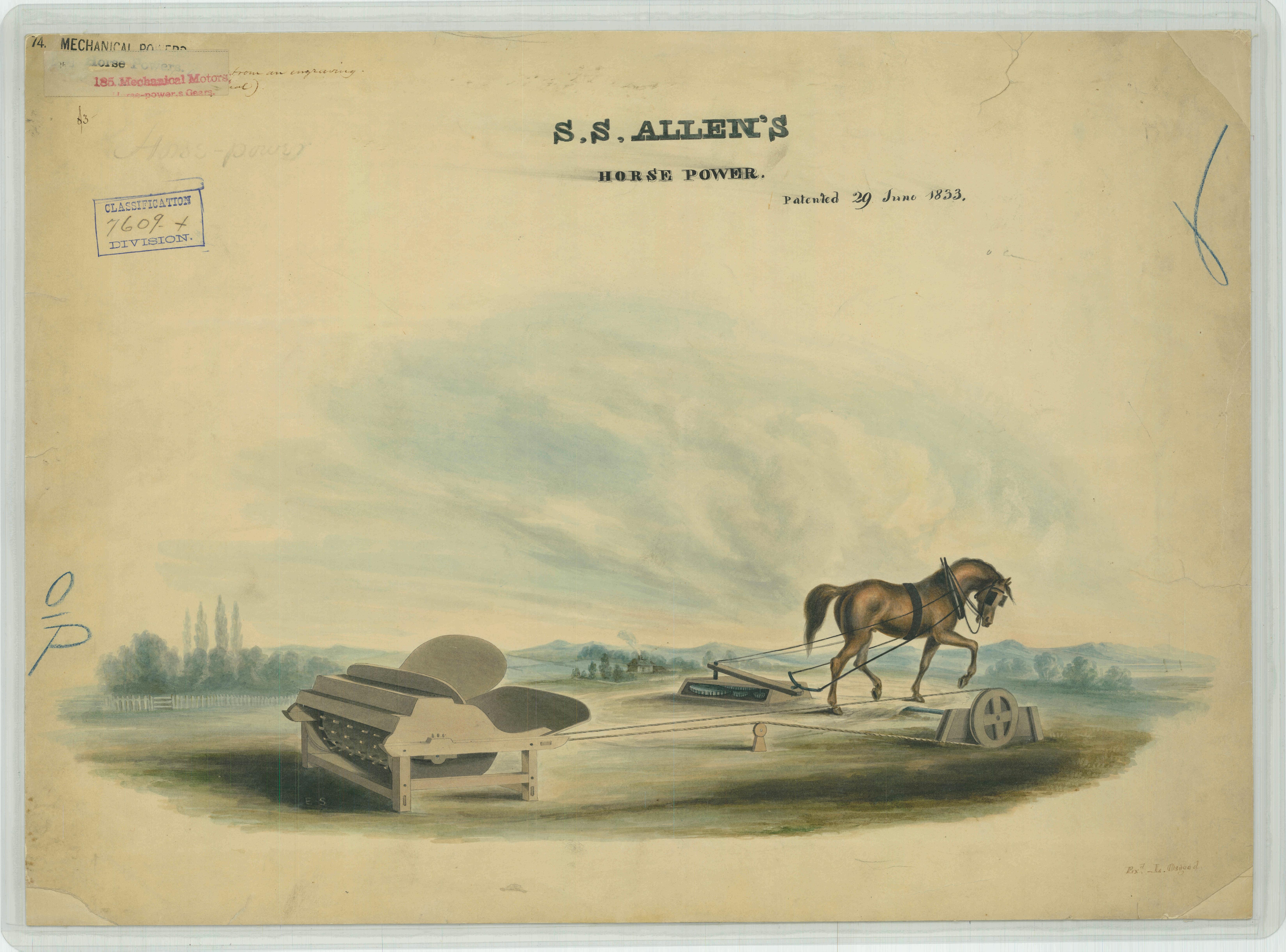 RG 241: Restored Patents, 7888X. J. Hale and A. Hale’s Patent Drawing for a Machine for the Application of Animal Power.   NAID: 169379052.