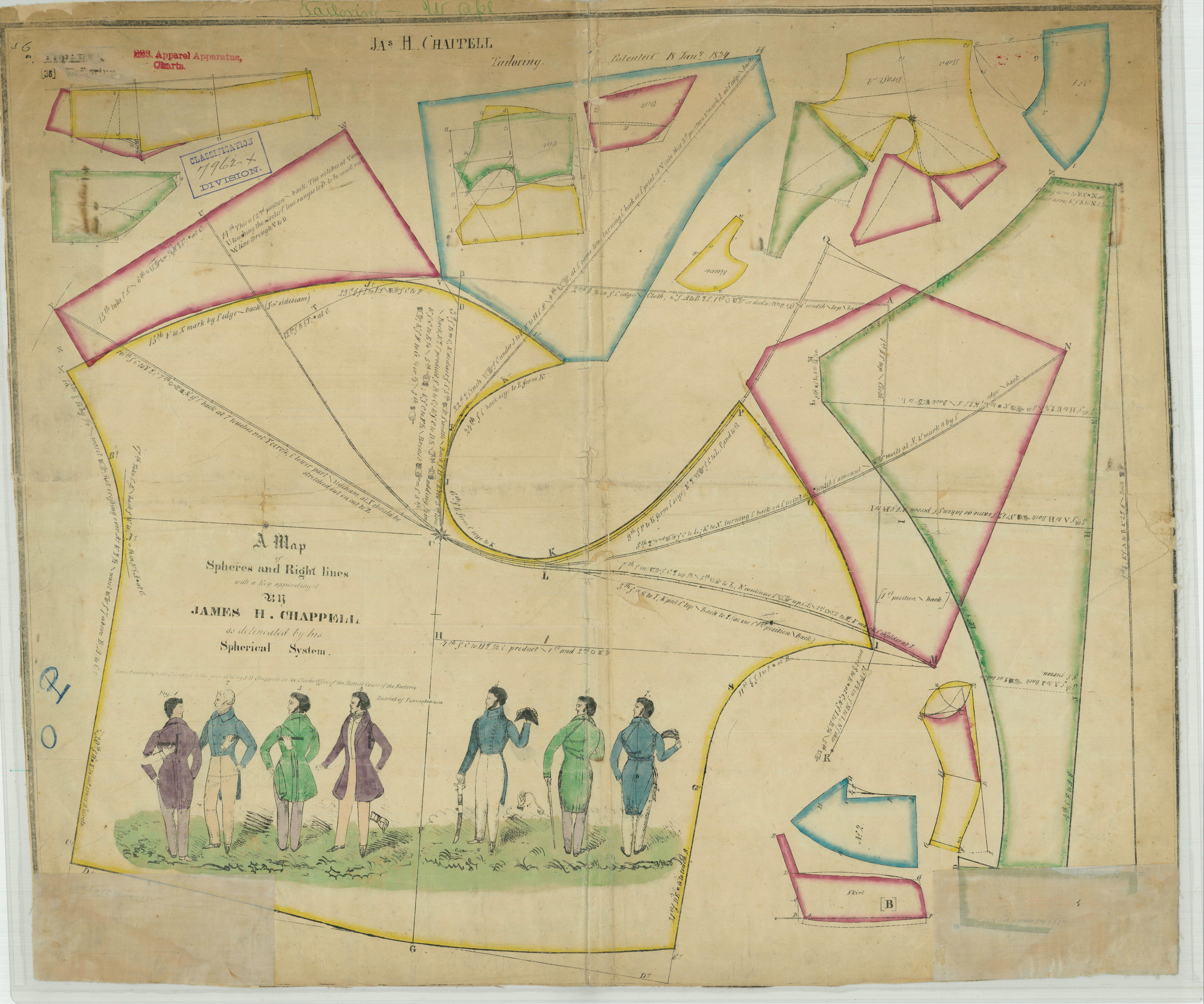 RG 241: Restored Patent Drawings, 1837-1847. Patent Number 7962X. J.A. and H. Chappel’s Patent Drawing for a Pattern for Tailoring, 1/18/1834. NAID: 169379103