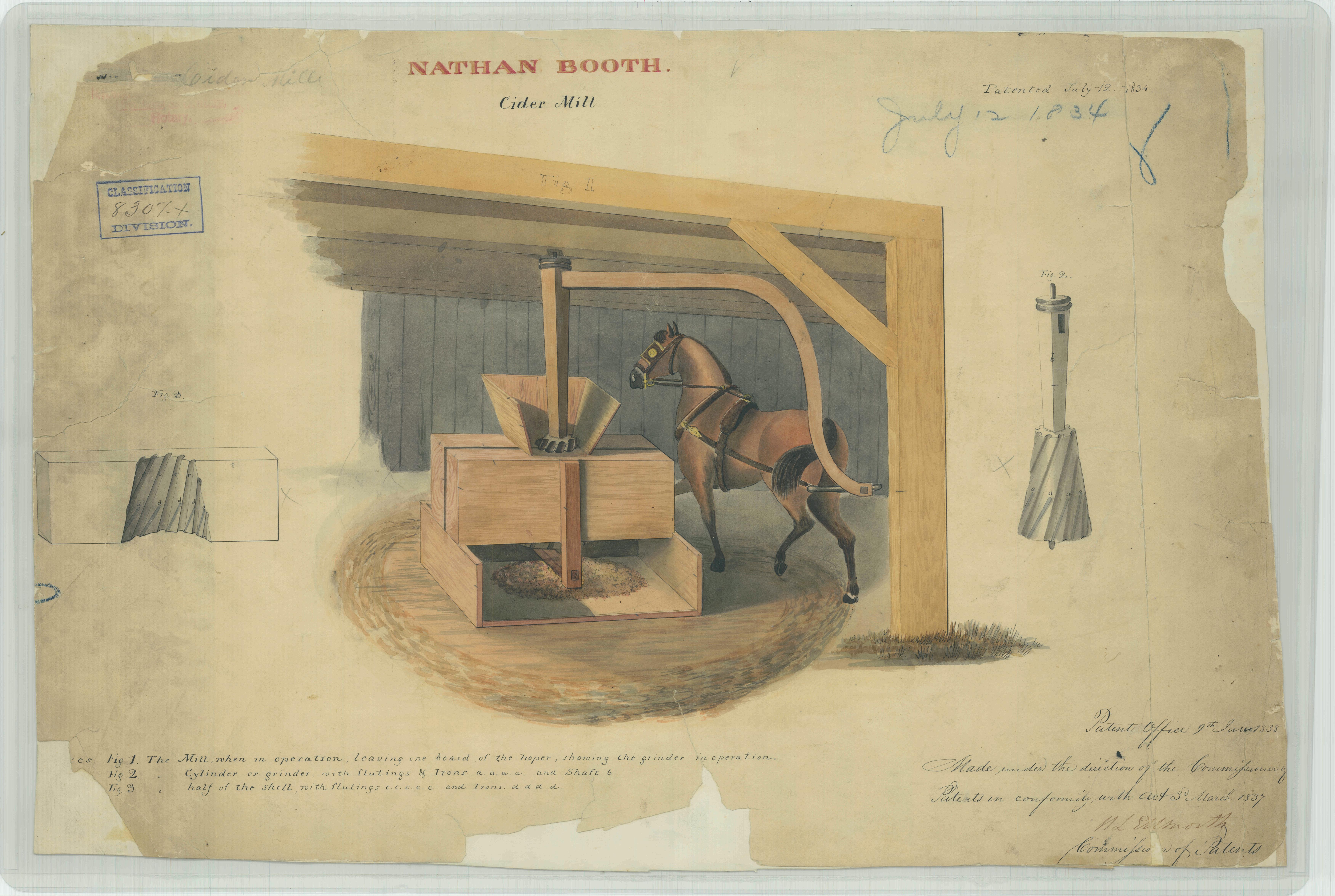 RG 241: Restored Patents, 8307X.  Nathan Booth’s Patent Drawing for a Cider Mill.                   NAID: 178329128.