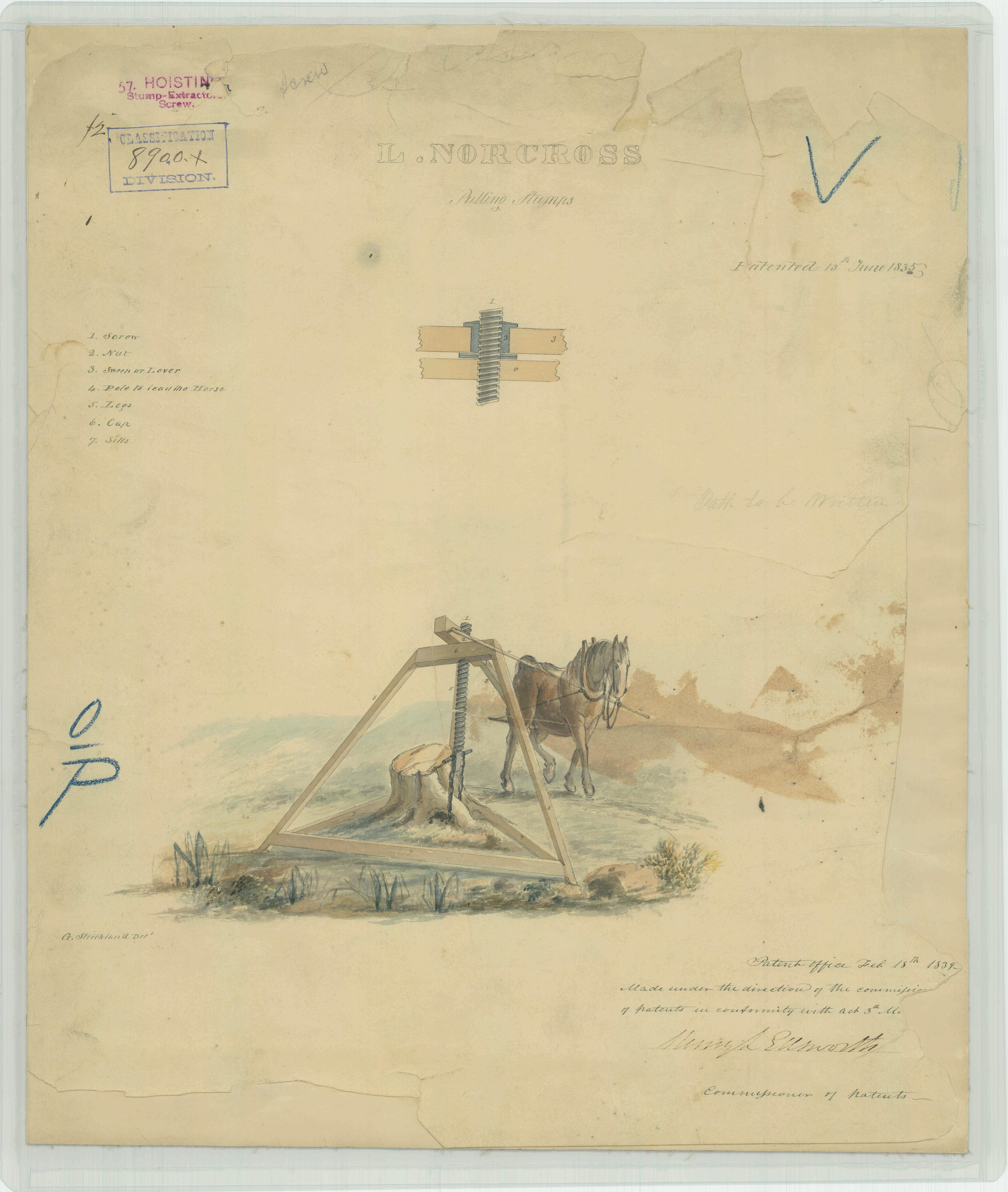 RG 241: Restored Patents, 8900X.  L. Norcross’ Patent Drawing for a Machine for Pulling Stumps.  NAID: 178329421.