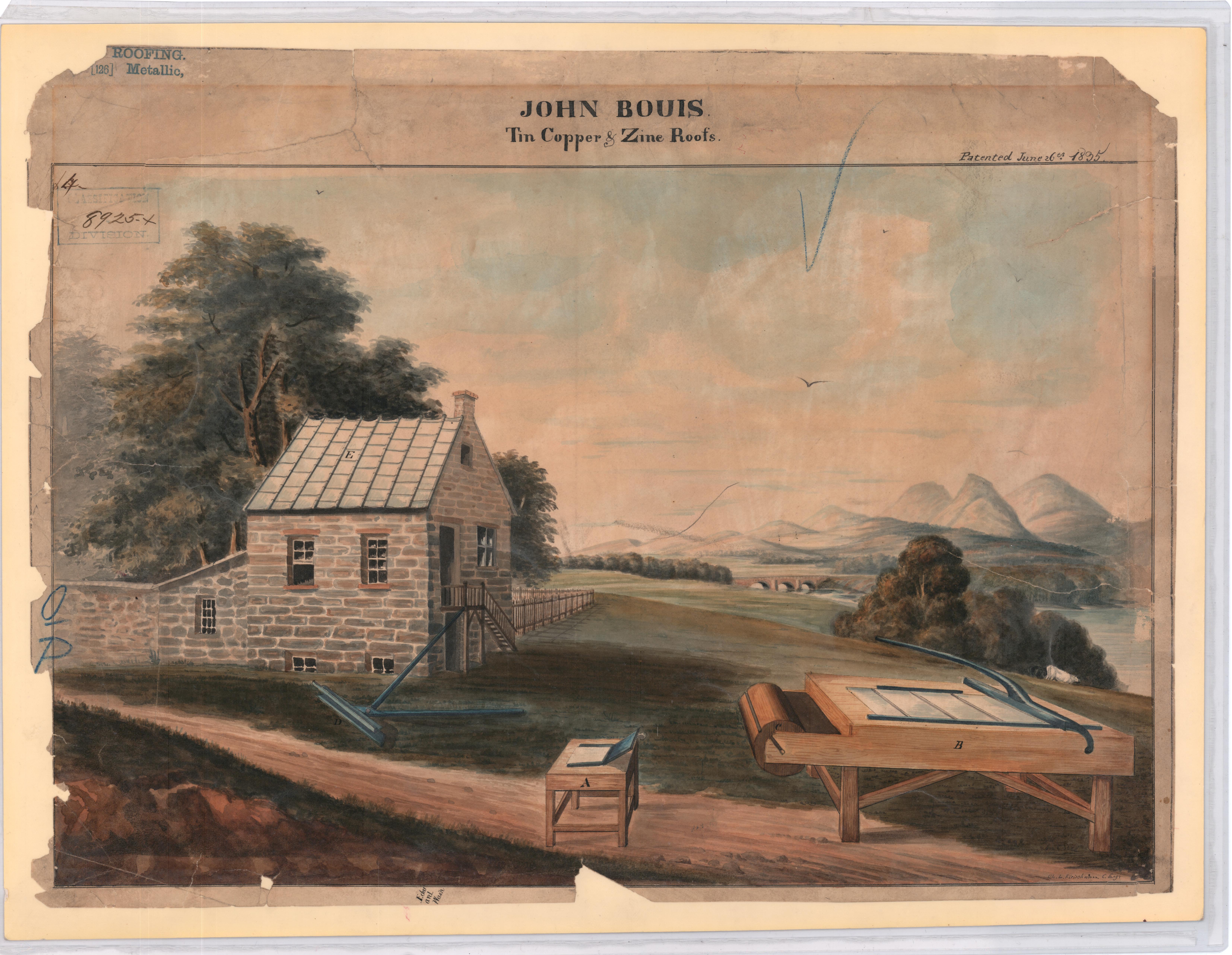RG 241: Restored Patents, 8925X.  John Bouis’ Patent Drawing for Tin, Copper, and Zinc Roofs.  NAID: 178329447.