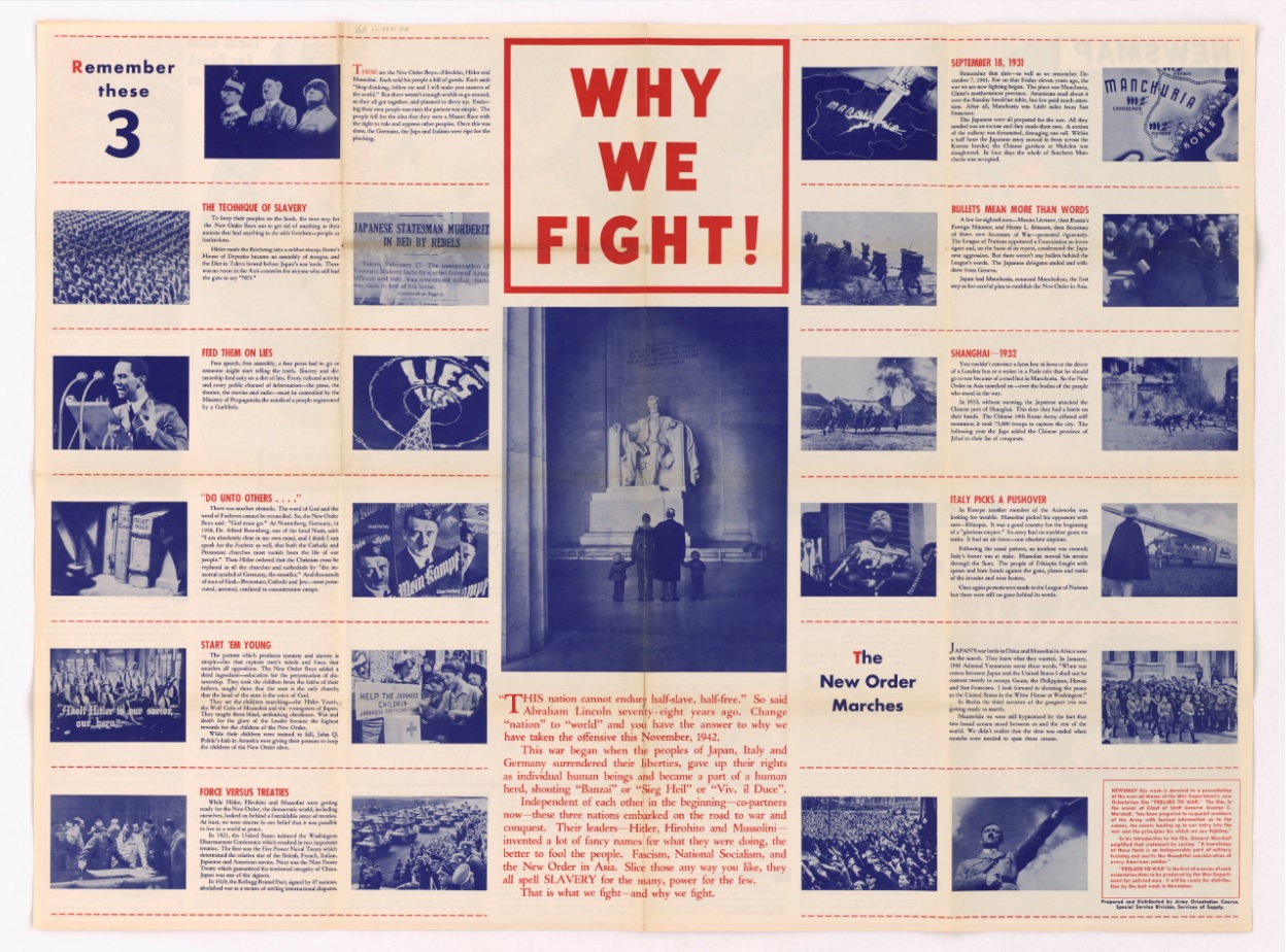 Why We Fight stands among the most ambitious and successful film projects ever undertaken by the United States government. Over the course of seven films, released from 1942 to 1945, director Frank Capra and his team argued forcefully for American service-people and civilians to unite in the massive labor of defeating the Axis Powers and defending American values. All seven films, restored with funding from the National Film Preservation Foundation, are available on the National Archives YouTube Channel.