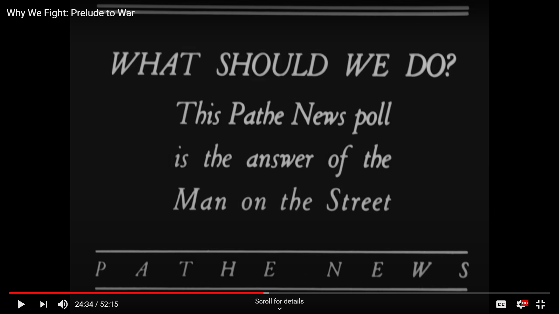 Many of these events seen in the film were documented by newsreel companies. Prelude to War includes some footage of Italy’s invasion of Ethiopia identical to that which appears in a Fox Movietone newsreel held by the National Archives, https://catalog.archives.gov/id/29551. The only footage in the film which appears with a visible source citation is a series of vox pops from a Pathe newsreel in which Americans voice their opinions for or against joining the war in Europe.