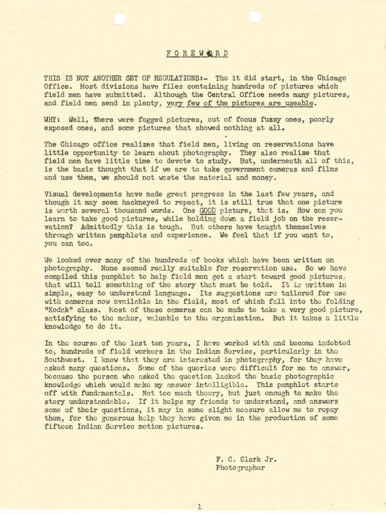 Additionally, we’ve included the pamphlet “Make Your Pictures Pay Off” by Fred C. Clark Jr., Photographer, U.S. Indian Service. This entertaining instructional guide is divided into two parts “The first concerns itself with the technical details, the second with picture interest.” The pamphlet was published in 1946 and is an engaging look at the process behind many of the fascinating photographs contained within Record Group 75.