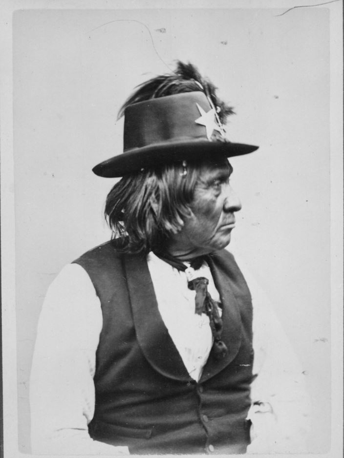 Our search returned 24 results of photographs related to the Comanche Nation of Oklahoma, including this image of Silver Brooch. The image is from series 75-ID, which is contained within the Still Pictures Branch of the National Archives. The subjects depicted in series 75-ID are Native American delegates that travelled to Washington, D.C. in 1872. These wonderful portraits were taken by Alexander Gardner and one-time partner Mathew Brady. The series is fully digitized and available online.