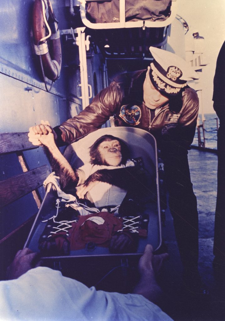 This photo was located in the Color Photographs Index after searching for the “USS Donner,” which was involved in launching Ham the Chimpanzee into space in January, 1961. The color image was taken before 1964, and was “Transferred to NARA.” With this information, the photo is located within the series 255-GC. To locate the image, note the subject matter as related to the “Mercury-Redstone II,” and the identifier number is MR 2-6. Therefore the full photograph’s number is 255-GC-MR2-6.