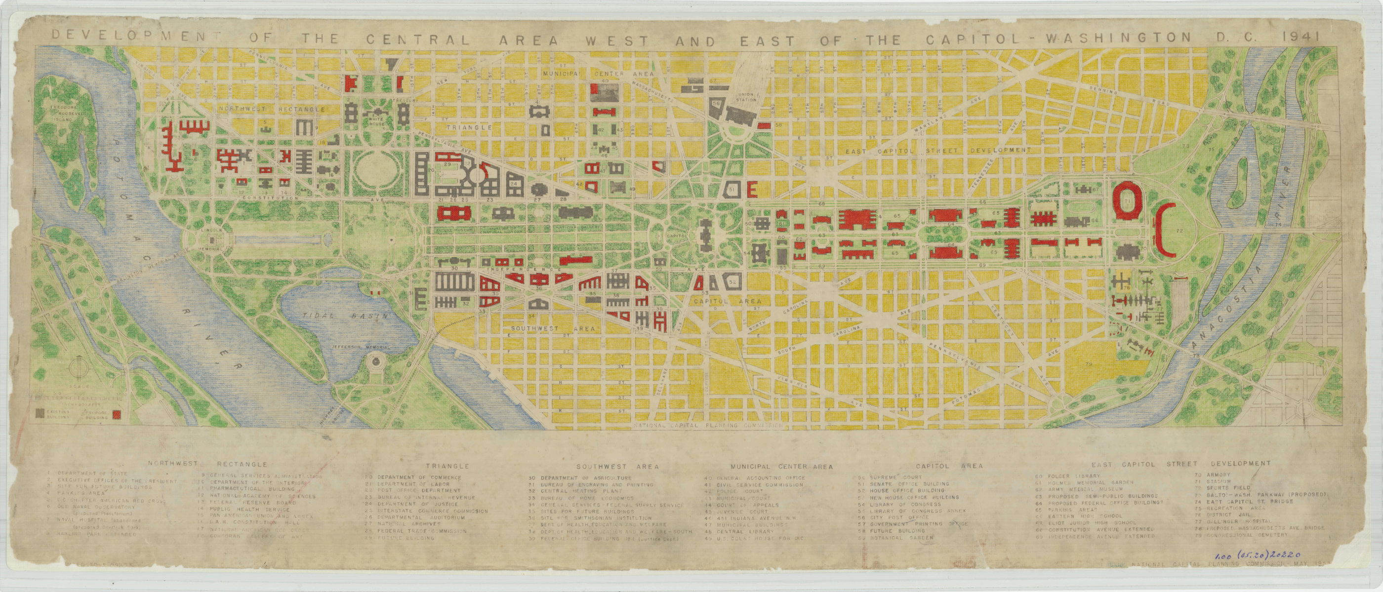 Our final map, “Proposed Plan for the Development of Central Washington, DC West and East of the Capitol, 1941” comes from RG 328: Records of the National Capitol and Planning Commission, 1900-2000 (NAID 5928303). Now, we have a map is that recognizable and, admittedly, quite colorful!