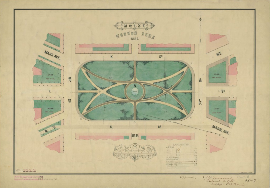 The first park drawing on offer depicts what once was, but is no longer – not in this precise form, anyway. This map of Mount Vernon Park (1882), found in RG 79: National Capital Parks Numbered Drawings, shows a fairly large green space situated between 7th Street and 9th Street, where Massachusetts Avenue and New York Avenue theoretically cross one another. Originally, this site contained what appears to be a fairly large fountain in the middle and two small public drinking fountains on the right and the left. While there is still quite a bit of green space in this location, this particular square has been home to the Carnegie Library since 1903. However, if you look at the Google map satellite image of this area and zoom in, you can still see part of the original curved walking paths on the right side that were kept as they had originally been.