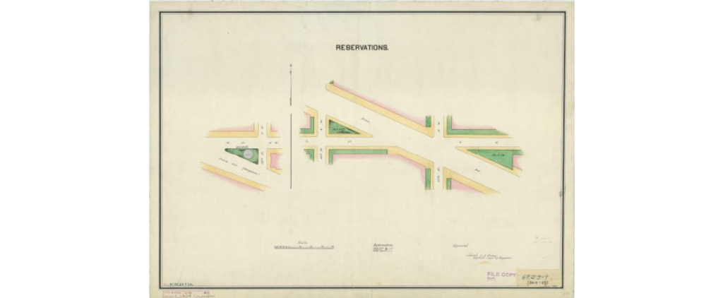 Below is an example of a reservation drawing located within Washington, D.C. These drawings come from RG 79: National Capital Parks Numbered Drawings. Based on the sketches, it is fairly easy to ascertain how small these little plots are. Reservation No. 23 is only three trees and a fountain wide!